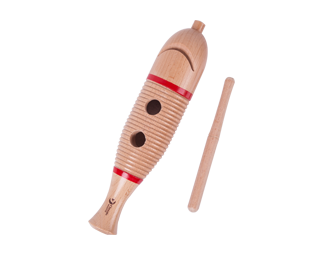 木质类乐器,刮棒呈锯齿形,演奏时用刮棒刮奏圆筒,发出“呱呱呱”的声音。