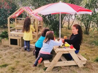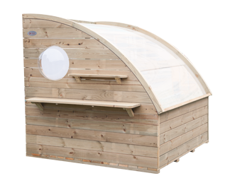 The Sunny House with fully sealed sunlight roof panel that can be used as a drawing board. A beautiful outdoor environment for pretend play.