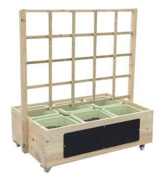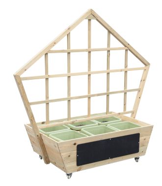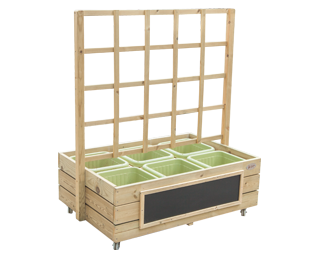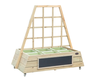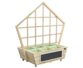 The 6-tub planter with rear trellis comes in 4 shapes (Pentagonal, Triangular, Square, and Trapezoidal). It does not require a large amount of soil or space and allows the children to grow a variety of climbing plants.