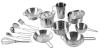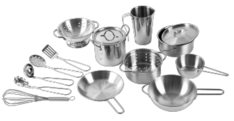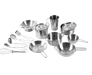 The tableware is made of stainless steel, it can be ued indoor and outdoor. It's a perfect set for role play and home play.