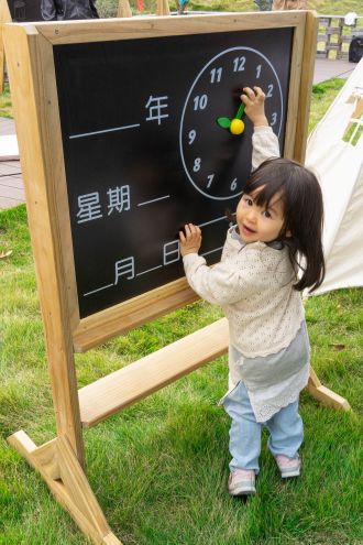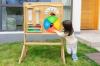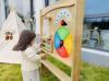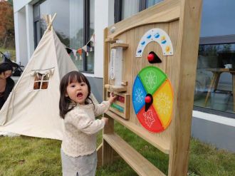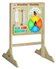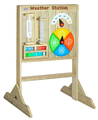 The weather station features a thermometer and interactive knobs that showcase images such as four seasons and rainfall. Children can move the interative knobs to indicate today's forecast.