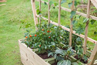 The 6-tub planter with rear trellis comes in 4 shapes (Pentagonal, Triangular, Square, and Trapezoidal). It does not require a large amount of soil or space.