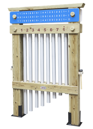户外八音管钟由八根长度不同的铝管组成,分别可以发出八个不同的音高,顶部蓝色乐谱板的正反面配有不同的歌曲简谱,孩子对照简谱可以敲出好听的歌曲。