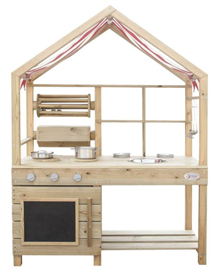 户外黑白画板: 小木屋造型, 内部活动空间大, 分别设计有黑板和亚克力白板, 小屋四周可自由进行组合。黑板和白板都可双面涂鸦, 黑板可用粉笔涂画, 白板可用可水洗水彩笔涂画。画板底部配有收纳架, 搭配水桶, 可以收纳画笔、粉笔和其他小物件。